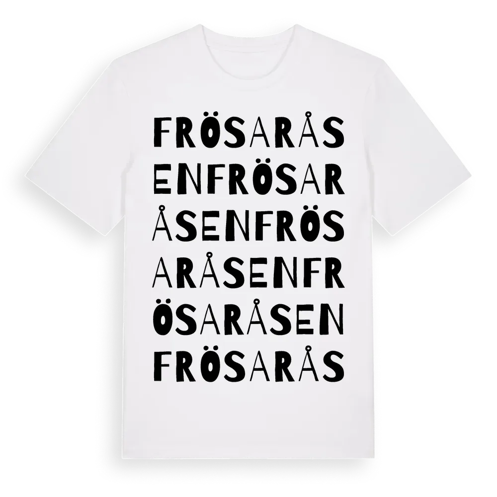 Frösaråsen ordlek t-shirt är inspirerad av byn Frösaråsen i Dalarnas län, Sverige. Tröjan är designad för dig som har en speciell koppling till platsen – oavsett om du bor här, har rötterna här eller bara älskar Frösaråsen.