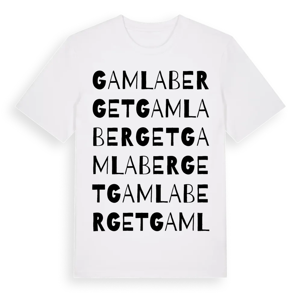Gamla Berget ordlek t-shirt är inspirerad av stadsdelen Gamla Berget i Dalarnas län, Sverige. Tröjan är designad för dig som har en speciell koppling till platsen – oavsett om du bor här, har rötterna här eller bara älskar Gamla Berget.