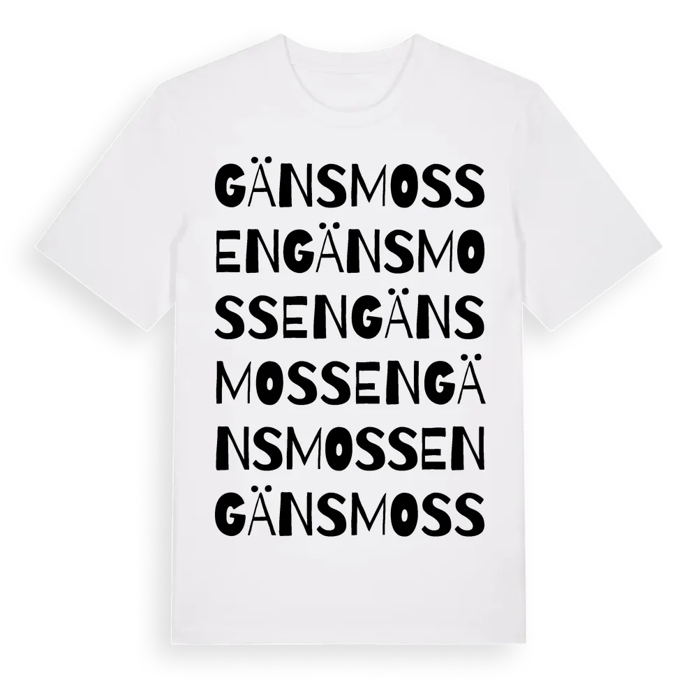 Gänsmossen ordlek t-shirt är inspirerad av Gänsmossen i Dalarnas län, Sverige. Tröjan är designad för dig som har en speciell koppling till platsen – oavsett om du bor här, har rötterna här eller bara älskar Gänsmossen.
