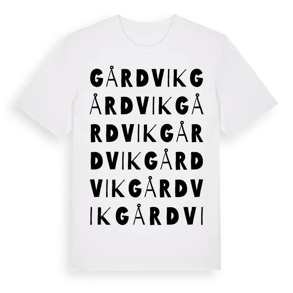Gårdvik ordlek t-shirt är inspirerad av byn Gårdvik i Dalarnas län, Sverige. Tröjan är designad för dig som har en speciell koppling till platsen – oavsett om du bor här, har rötterna här eller bara älskar Gårdvik.