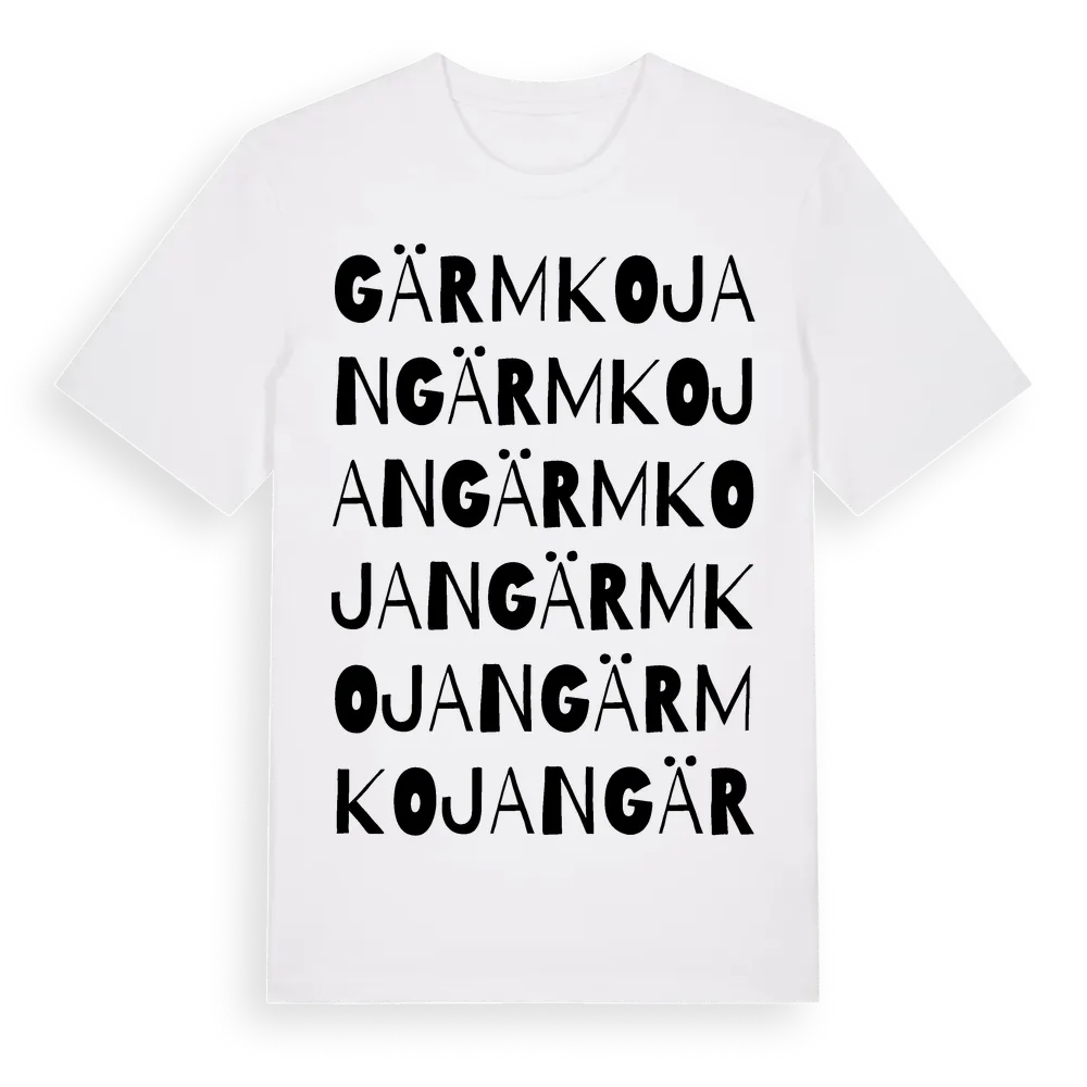 Gärmkojan ordlek t-shirt är inspirerad av Gärmkojan i Dalarnas län, Sverige. Tröjan är designad för dig som har en speciell koppling till platsen – oavsett om du bor här, har rötterna här eller bara älskar Gärmkojan.
