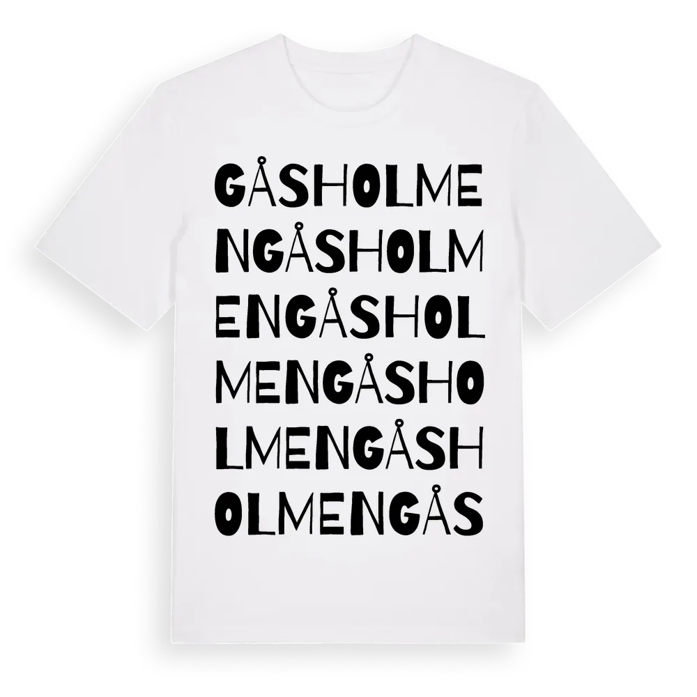 Gåsholmen ordlek t-shirt är inspirerad av byn Gåsholmen i Dalarnas län, Sverige. Tröjan är designad för dig som har en speciell koppling till platsen – oavsett om du bor här, har rötterna här eller bara älskar Gåsholmen.