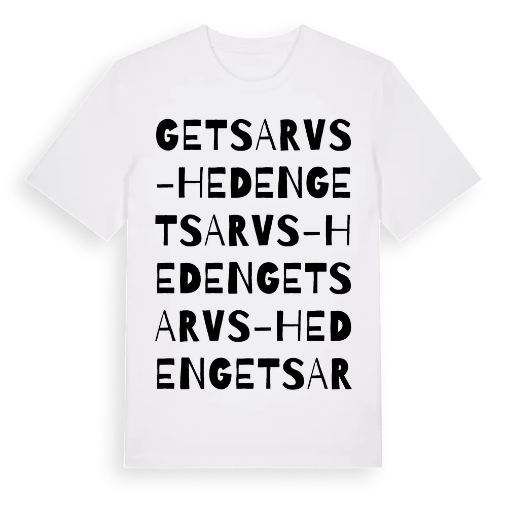 Getsarvs-Heden ordlek t-shirt är inspirerad av Getsarvs-Heden i Dalarnas län, Sverige. Tröjan är designad för dig som har en speciell koppling till platsen – oavsett om du bor här, har rötterna här eller bara älskar Getsarvs-Heden.