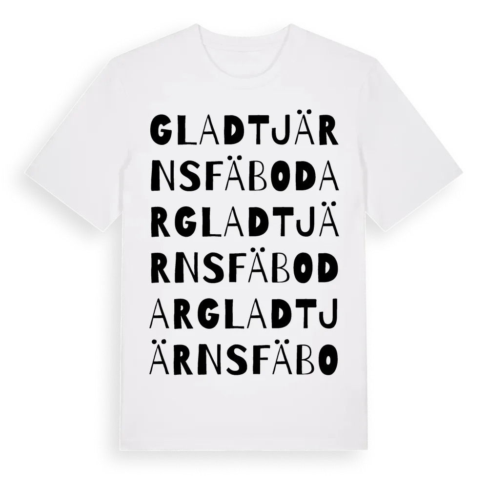 Gladtjärns Fäbodar ordlek t-shirt är inspirerad av Gladtjärns Fäbodar i Dalarnas län, Sverige. Tröjan är designad för dig som har en speciell koppling till platsen – oavsett om du bor här, har rötterna här eller bara älskar Gladtjärns Fäbodar.