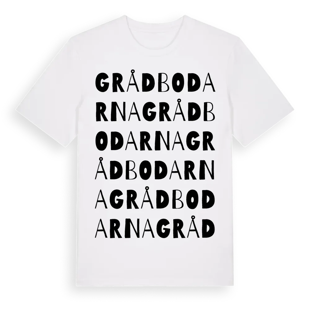 Grådbodarna ordlek t-shirt är inspirerad av byn Grådbodarna i Dalarnas län, Sverige. Tröjan är designad för dig som har en speciell koppling till platsen – oavsett om du bor här, har rötterna här eller bara älskar Grådbodarna.