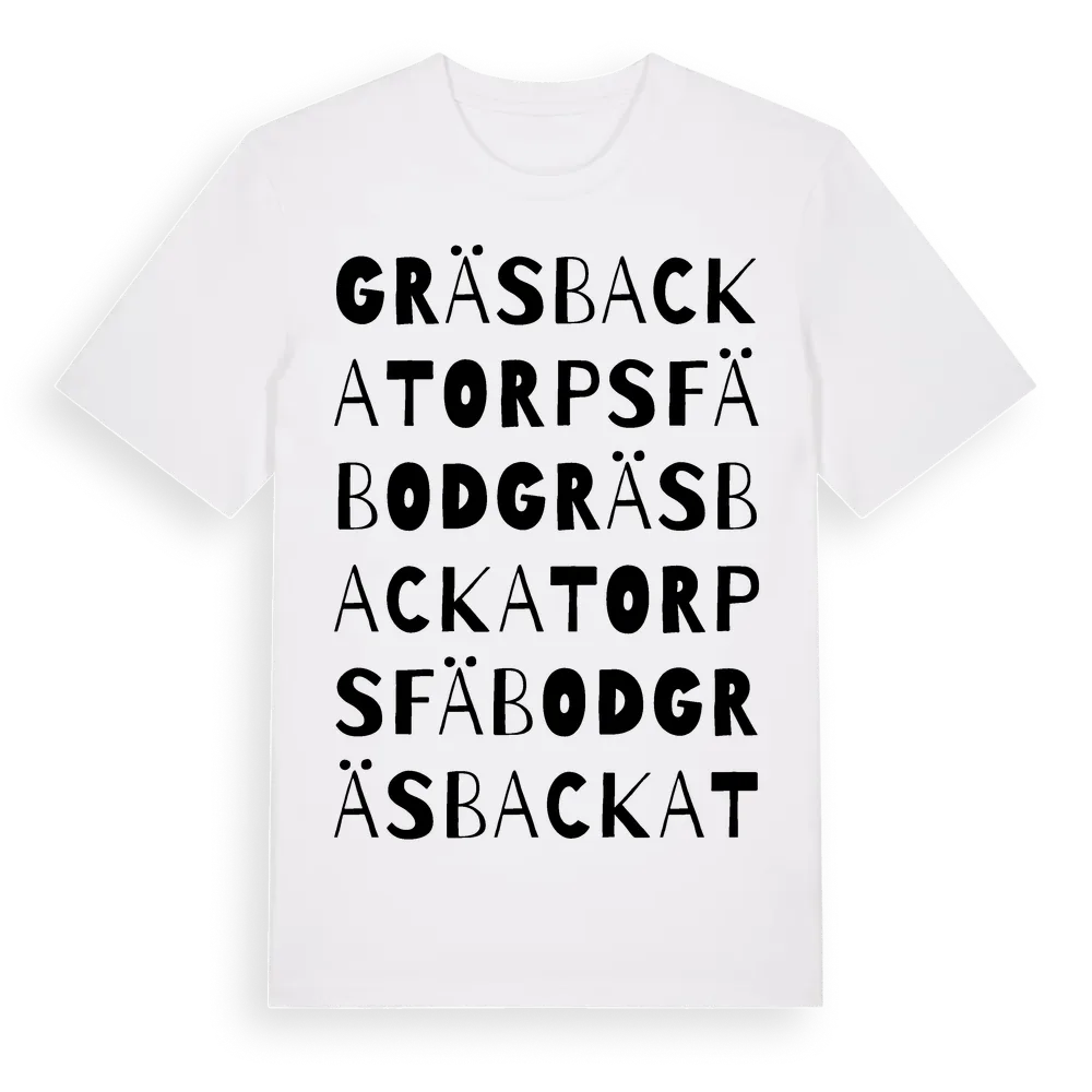 Gräsbackatorps Fäbod ordlek t-shirt är inspirerad av Gräsbackatorps Fäbod i Dalarnas län, Sverige. Tröjan är designad för dig som har en speciell koppling till platsen – oavsett om du bor här, har rötterna här eller bara älskar Gräsbackatorps Fäbod.