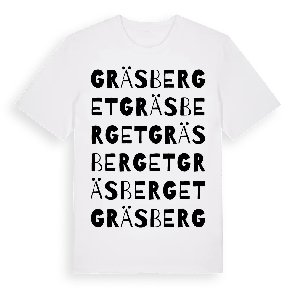 Gräsberget ordlek t-shirt är inspirerad av byn Gräsberget i Dalarnas län, Sverige. Tröjan är designad för dig som har en speciell koppling till platsen – oavsett om du bor här, har rötterna här eller bara älskar Gräsberget.