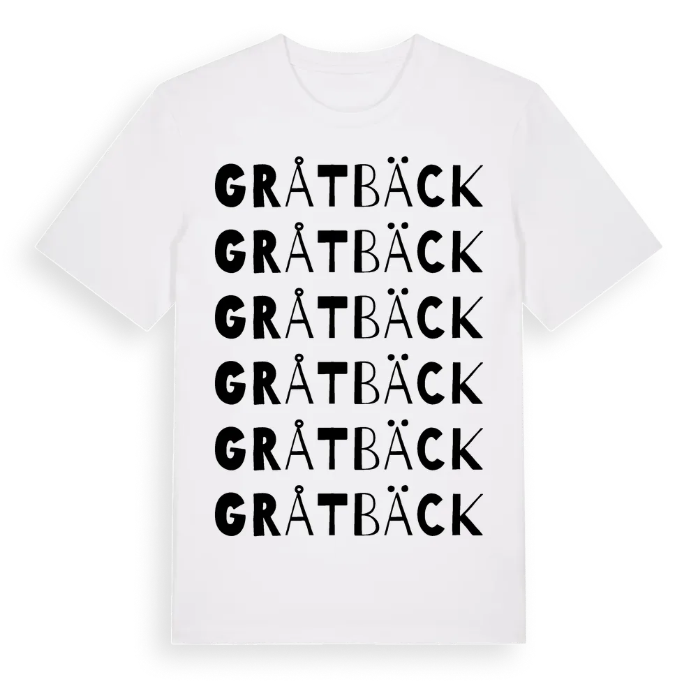 Gråtbäck ordlek t-shirt är inspirerad av Gråtbäck i Dalarnas län, Sverige. Tröjan är designad för dig som har en speciell koppling till platsen – oavsett om du bor här, har rötterna här eller bara älskar Gråtbäck.