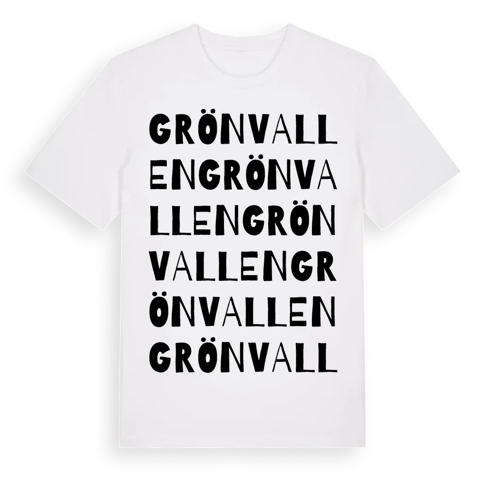 Grönvallen ordlek t-shirt är inspirerad av byn Grönvallen i Dalarnas län, Sverige. Tröjan är designad för dig som har en speciell koppling till platsen – oavsett om du bor här, har rötterna här eller bara älskar Grönvallen.
