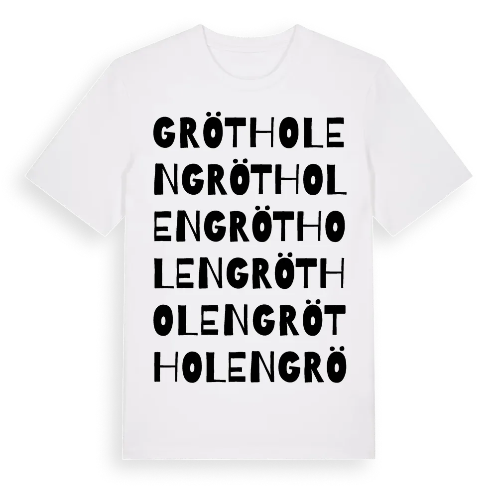Grötholen ordlek t-shirt är inspirerad av byn Grötholen i Dalarnas län, Sverige. Tröjan är designad för dig som har en speciell koppling till platsen – oavsett om du bor här, har rötterna här eller bara älskar Grötholen.