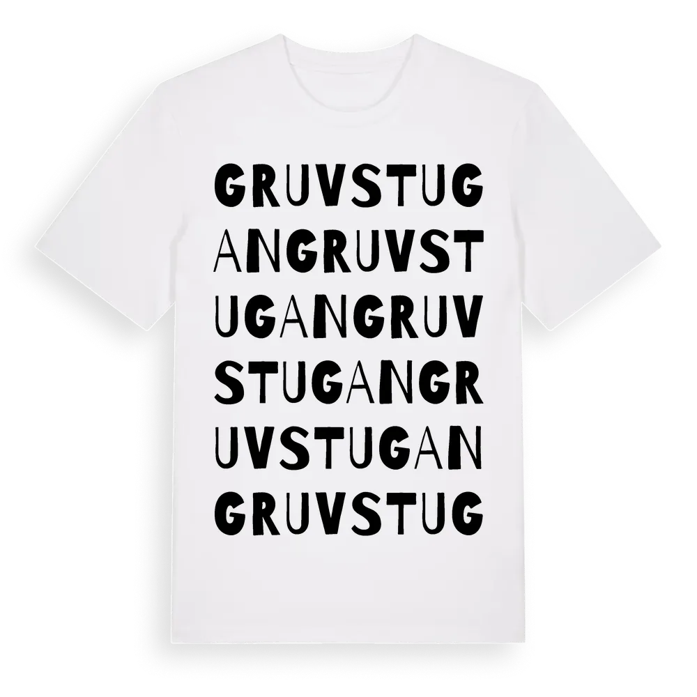 Gruvstugan ordlek t-shirt är inspirerad av Gruvstugan i Dalarnas län, Sverige. Tröjan är designad för dig som har en speciell koppling till platsen – oavsett om du bor här, har rötterna här eller bara älskar Gruvstugan.