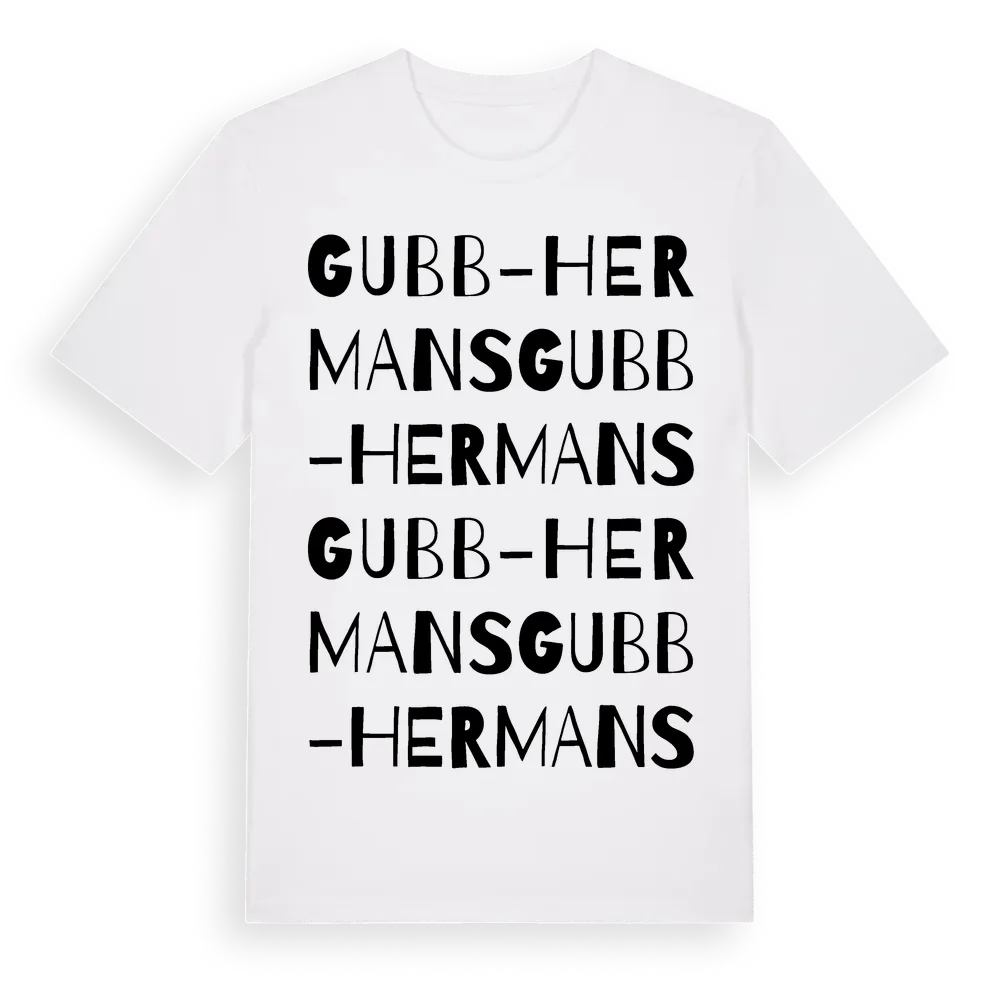 Gubb-Hermans ordlek t-shirt är inspirerad av Gubb-Hermans i Dalarnas län, Sverige. Tröjan är designad för dig som har en speciell koppling till platsen – oavsett om du bor här, har rötterna här eller bara älskar Gubb-Hermans.