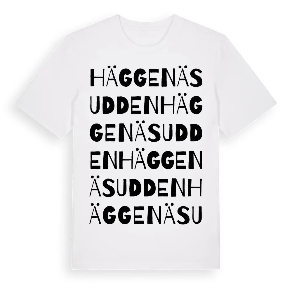 Häggenäsudden ordlek t-shirt är inspirerad av Häggenäsudden i Dalarnas län, Sverige. Tröjan är designad för dig som har en speciell koppling till platsen – oavsett om du bor här, har rötterna här eller bara älskar Häggenäsudden.
