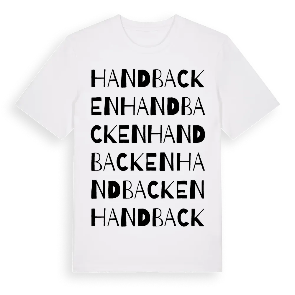 Handbacken ordlek t-shirt är inspirerad av byn Handbacken i Dalarnas län, Sverige. Tröjan är designad för dig som har en speciell koppling till platsen – oavsett om du bor här, har rötterna här eller bara älskar Handbacken.