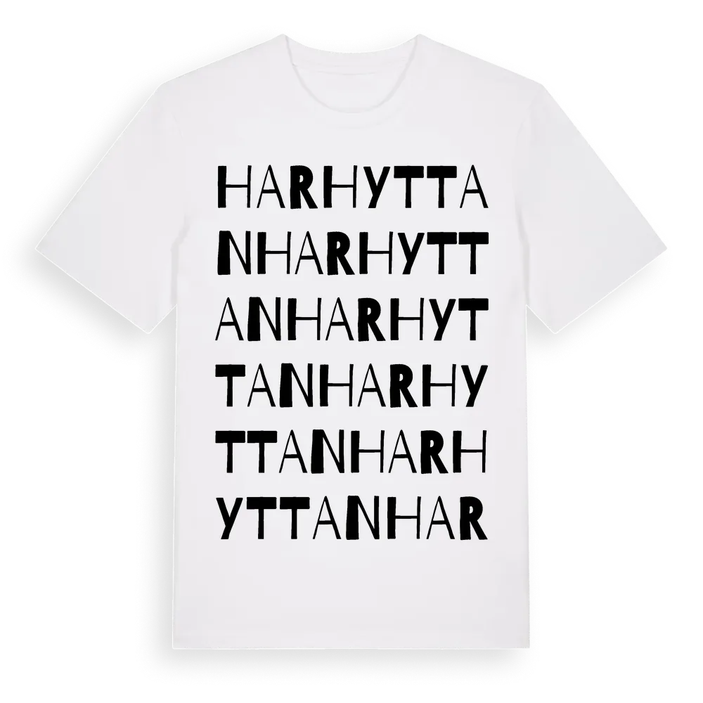 Harhyttan ordlek t-shirt är inspirerad av Harhyttan i Dalarnas län, Sverige. Tröjan är designad för dig som har en speciell koppling till platsen – oavsett om du bor här, har rötterna här eller bara älskar Harhyttan.