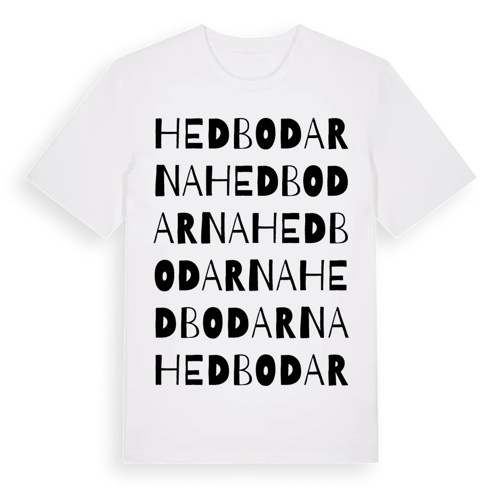Hedbodarna ordlek t-shirt är inspirerad av byn Hedbodarna i Dalarnas län, Sverige. Tröjan är designad för dig som har en speciell koppling till platsen – oavsett om du bor här, har rötterna här eller bara älskar Hedbodarna.