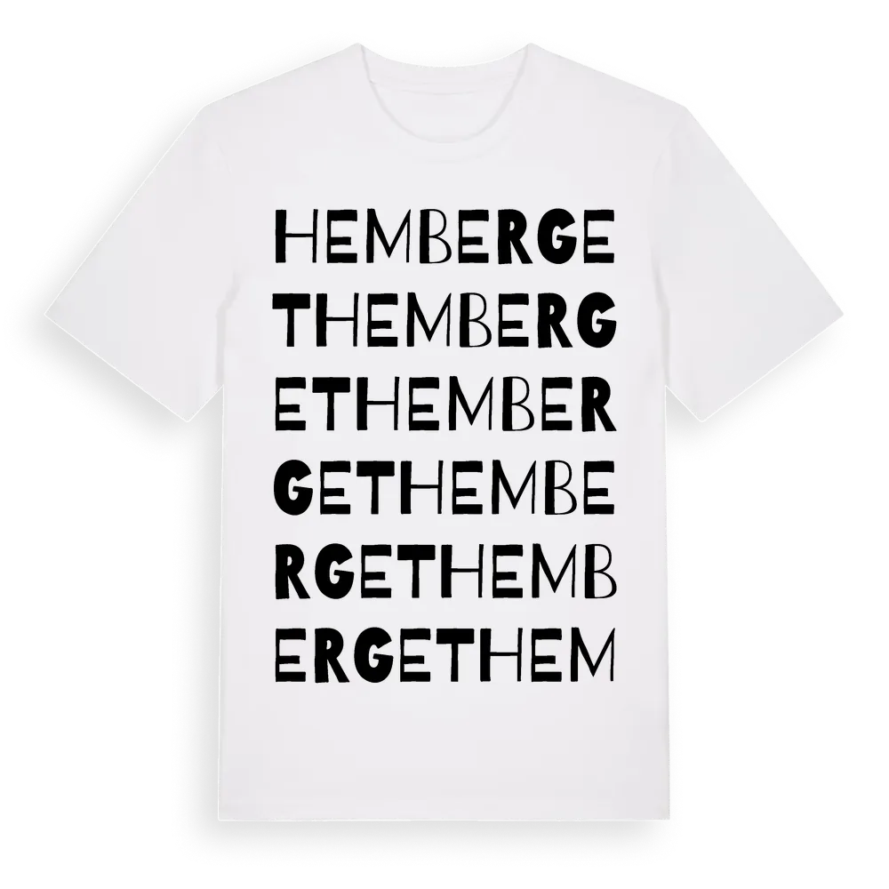 Hemberget ordlek t-shirt är inspirerad av byn Hemberget i Dalarnas län, Sverige. Tröjan är designad för dig som har en speciell koppling till platsen – oavsett om du bor här, har rötterna här eller bara älskar Hemberget.