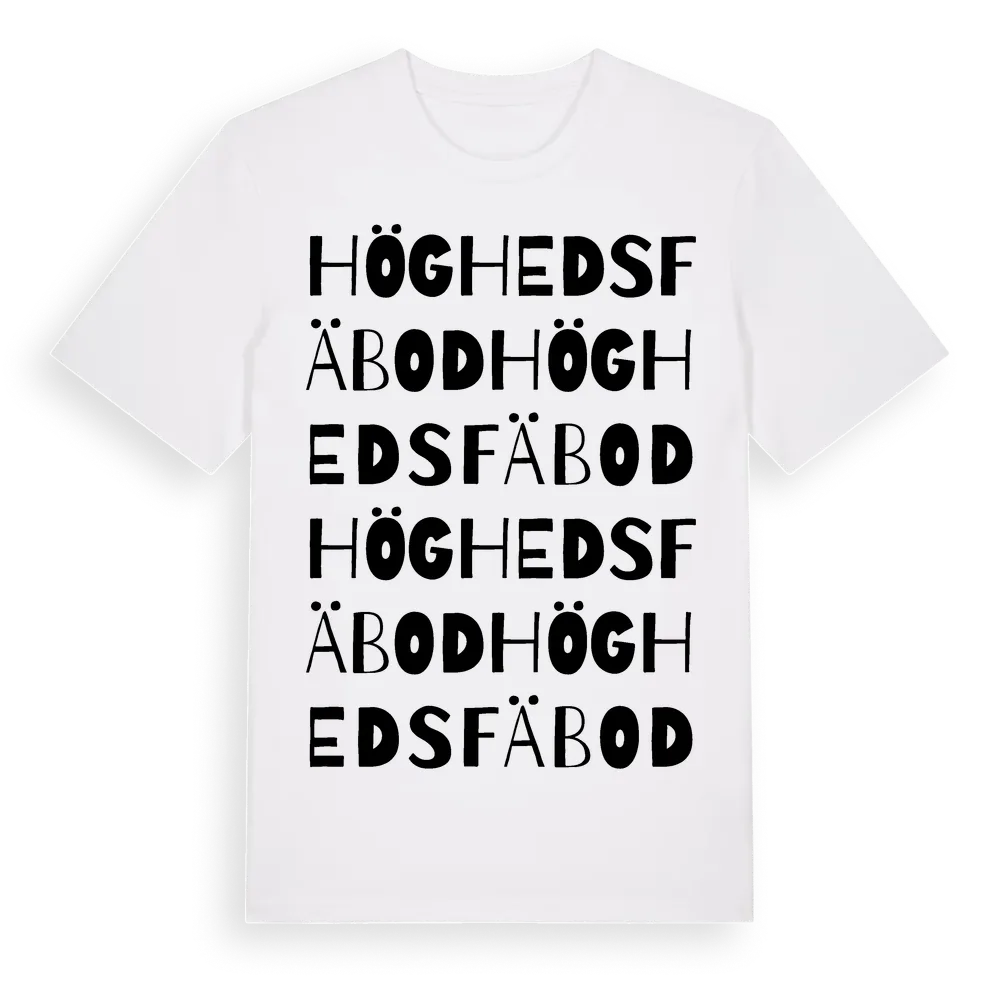 Högheds Fäbod ordlek t-shirt är inspirerad av byn Högheds Fäbod i Dalarnas län, Sverige. Tröjan är designad för dig som har en speciell koppling till platsen – oavsett om du bor här, har rötterna här eller bara älskar Högheds Fäbod.
