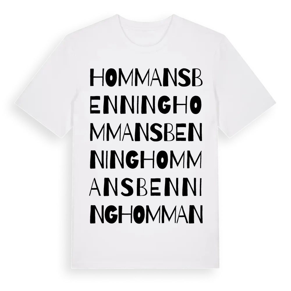 Hommansbenning ordlek t-shirt är inspirerad av Hommansbenning i Dalarnas län, Sverige. Tröjan är designad för dig som har en speciell koppling till platsen – oavsett om du bor här, har rötterna här eller bara älskar Hommansbenning.