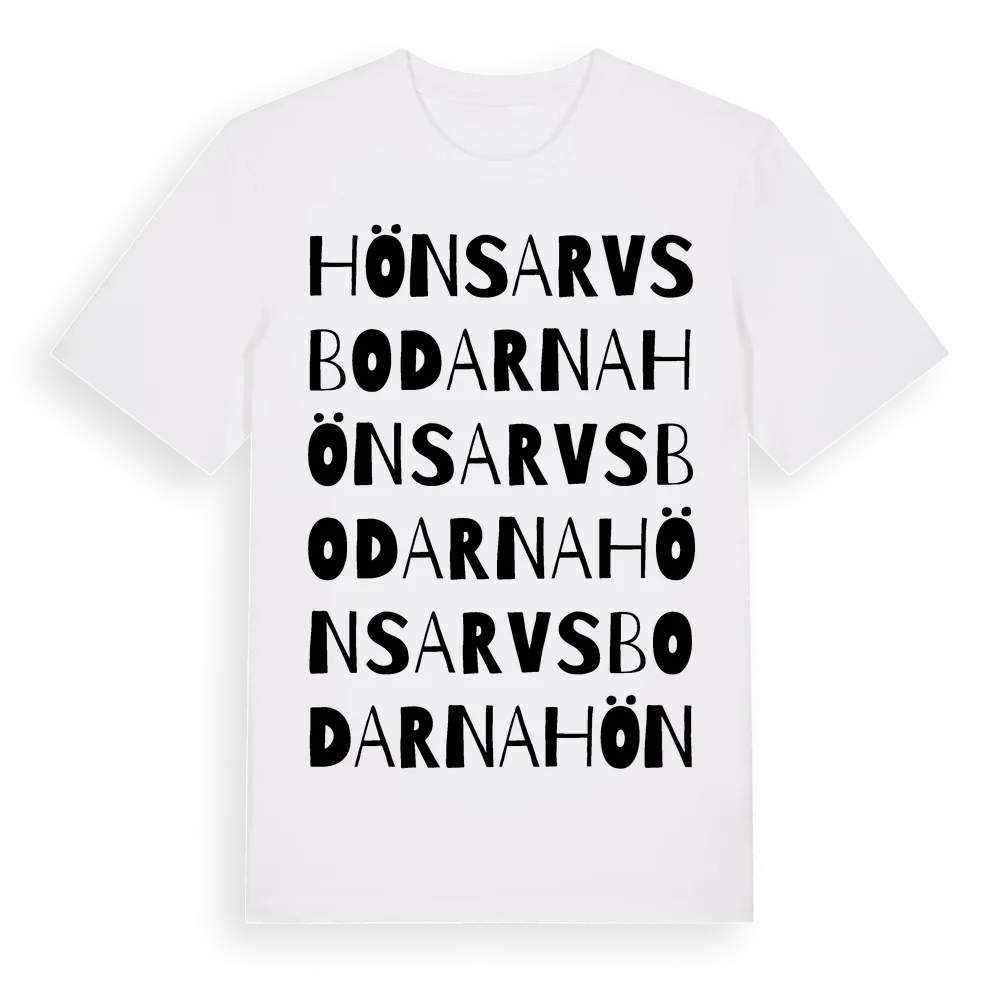 Hönsarvsbodarna ordlek t-shirt är inspirerad av Hönsarvsbodarna i Dalarnas län, Sverige. Tröjan är designad för dig som har en speciell koppling till platsen – oavsett om du bor här, har rötterna här eller bara älskar Hönsarvsbodarna.
