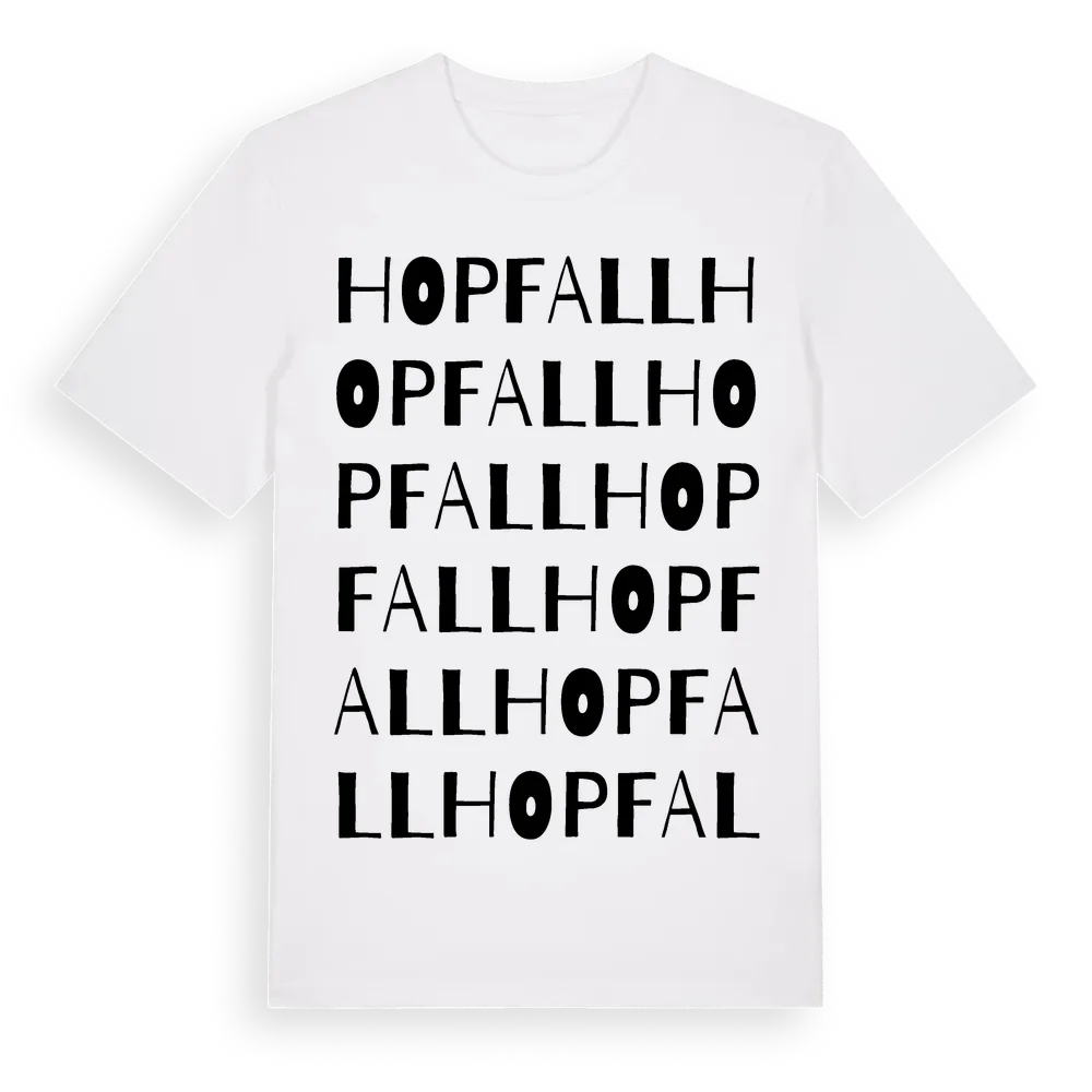 Hopfall ordlek t-shirt är inspirerad av Hopfall i Dalarnas län, Sverige. Tröjan är designad för dig som har en speciell koppling till platsen – oavsett om du bor här, har rötterna här eller bara älskar Hopfall.