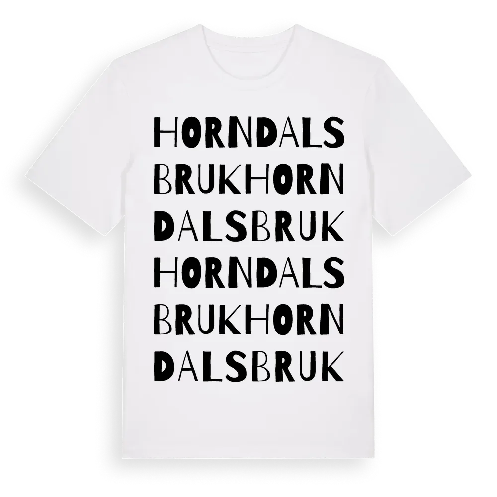 En ordlek byggd på Horndals Bruks namn. Subtilt och klurig – ett motiv som bara de som verkligen känner platsen fullt ut förstår. Premium bomull, unisex – från byn Horndals Bruk i Dalarnas län.