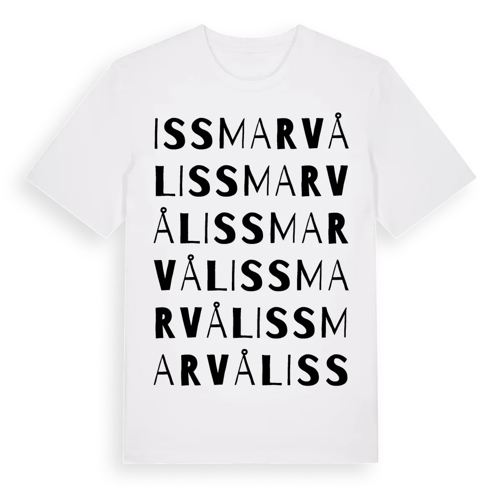 Issmarvål ordlek t-shirt är inspirerad av Issmarvål i Dalarnas län, Sverige. Tröjan är designad för dig som har en speciell koppling till platsen – oavsett om du bor här, har rötterna här eller bara älskar Issmarvål.