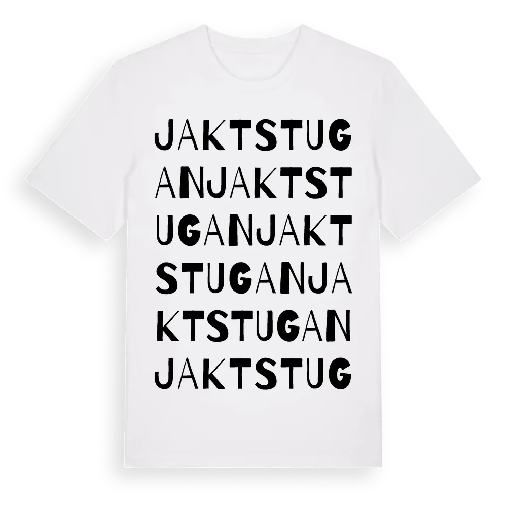 Jaktstugan ordlek t-shirt är inspirerad av Jaktstugan i Dalarnas län, Sverige. Tröjan är designad för dig som har en speciell koppling till platsen – oavsett om du bor här, har rötterna här eller bara älskar Jaktstugan.