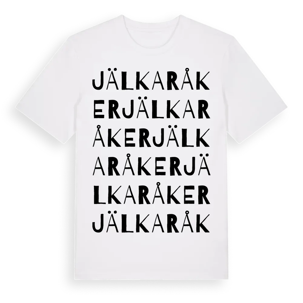 Jälkaråker ordlek t-shirt är inspirerad av byn Jälkaråker i Dalarnas län, Sverige. Tröjan är designad för dig som har en speciell koppling till platsen – oavsett om du bor här, har rötterna här eller bara älskar Jälkaråker.