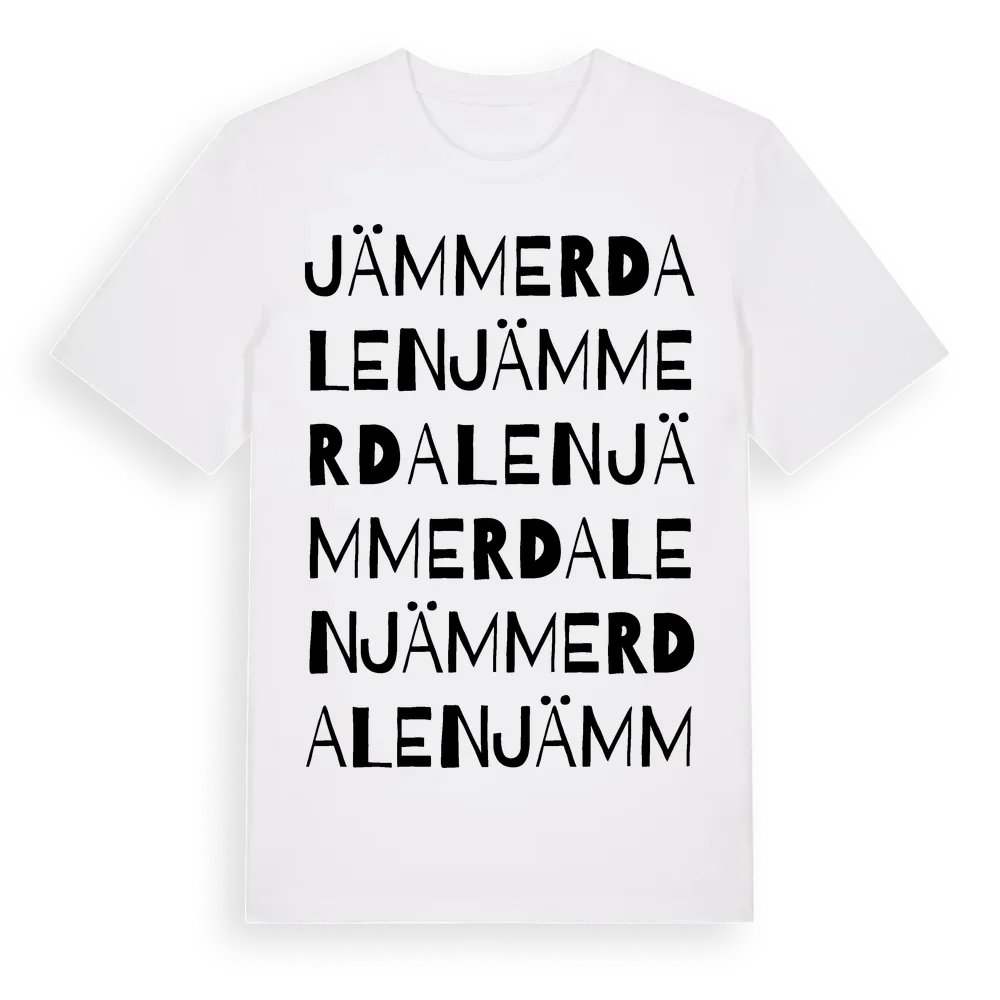 Jämmerdalen ordlek t-shirt är inspirerad av Jämmerdalen i Dalarnas län, Sverige. Tröjan är designad för dig som har en speciell koppling till platsen – oavsett om du bor här, har rötterna här eller bara älskar Jämmerdalen.
