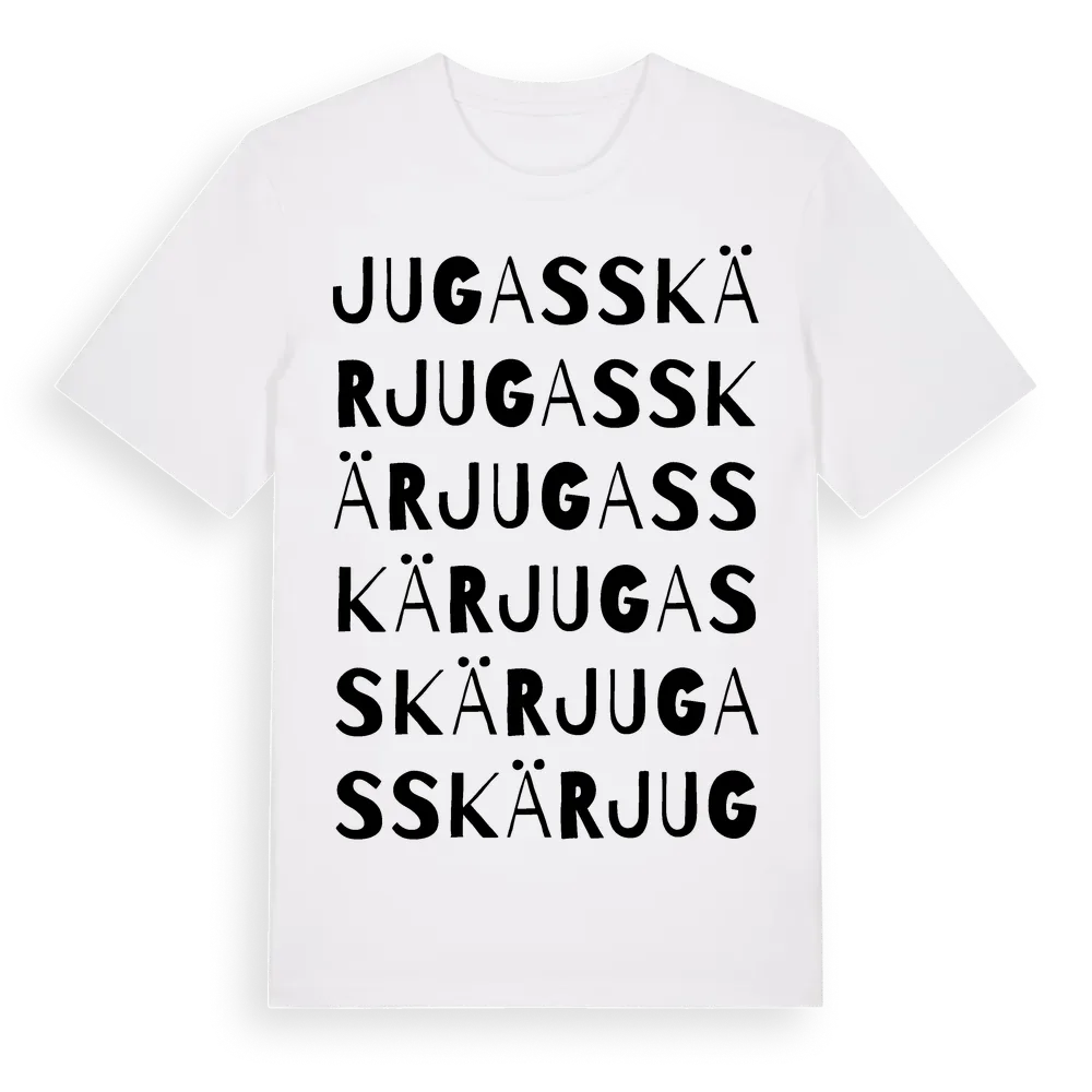 Jugasskär ordlek t-shirt är inspirerad av byn Jugasskär i Dalarnas län, Sverige. Tröjan är designad för dig som har en speciell koppling till platsen – oavsett om du bor här, har rötterna här eller bara älskar Jugasskär.