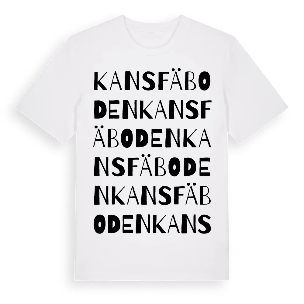 Kansfäboden ordlek t-shirt är inspirerad av Kansfäboden i Dalarnas län, Sverige. Tröjan är designad för dig som har en speciell koppling till platsen – oavsett om du bor här, har rötterna här eller bara älskar Kansfäboden.