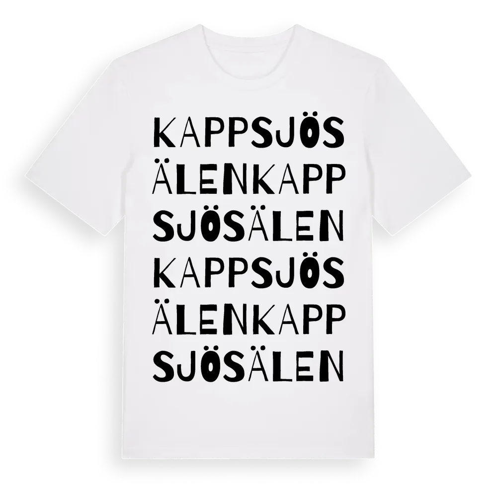 Kappsjösälen ordlek t-shirt är inspirerad av byn Kappsjösälen i Dalarnas län, Sverige. Tröjan är designad för dig som har en speciell koppling till platsen – oavsett om du bor här, har rötterna här eller bara älskar Kappsjösälen.