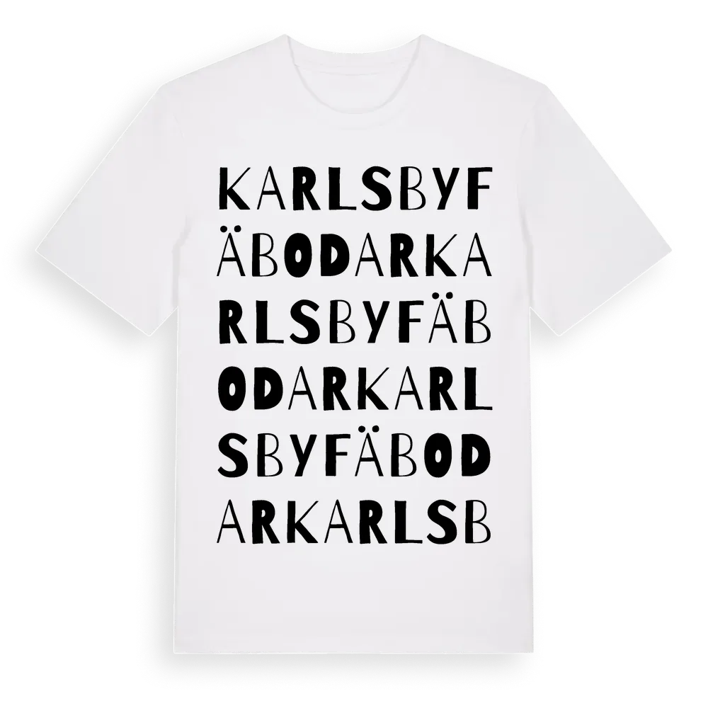 Karlsby Fäbodar ordlek t-shirt är inspirerad av byn Karlsby Fäbodar i Dalarnas län, Sverige. Tröjan är designad för dig som har en speciell koppling till platsen – oavsett om du bor här, har rötterna här eller bara älskar Karlsby Fäbodar.