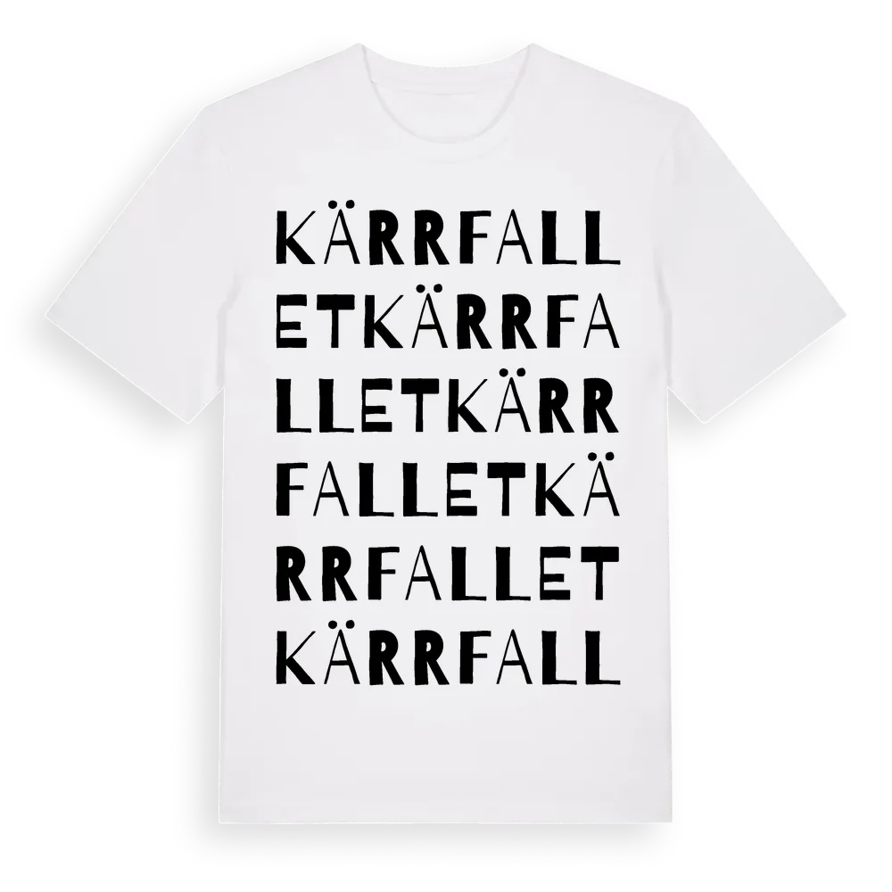 Kärrfallet ordlek t-shirt är inspirerad av byn Kärrfallet i Dalarnas län, Sverige. Tröjan är designad för dig som har en speciell koppling till platsen – oavsett om du bor här, har rötterna här eller bara älskar Kärrfallet.