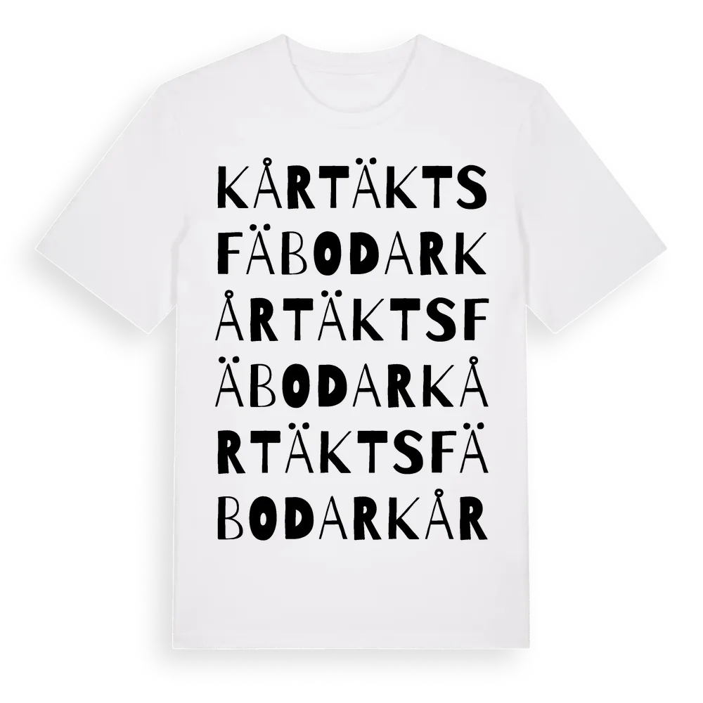 Kårtäkts Fäbodar ordlek t-shirt är inspirerad av byn Kårtäkts Fäbodar i Dalarnas län, Sverige. Tröjan är designad för dig som har en speciell koppling till platsen – oavsett om du bor här, har rötterna här eller bara älskar Kårtäkts Fäbodar.