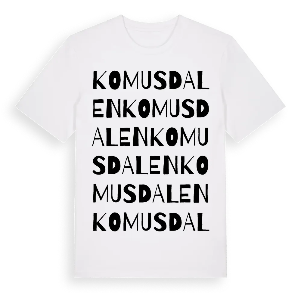 Komusdalen ordlek t-shirt är inspirerad av Komusdalen i Dalarnas län, Sverige. Tröjan är designad för dig som har en speciell koppling till platsen – oavsett om du bor här, har rötterna här eller bara älskar Komusdalen.