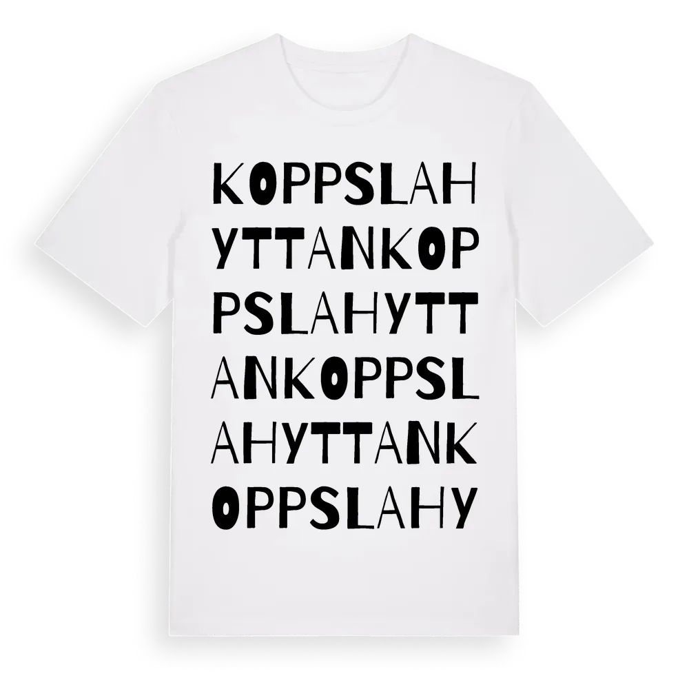 Koppslahyttan ordlek t-shirt är inspirerad av byn Koppslahyttan i Dalarnas län, Sverige. Tröjan är designad för dig som har en speciell koppling till platsen – oavsett om du bor här, har rötterna här eller bara älskar Koppslahyttan.