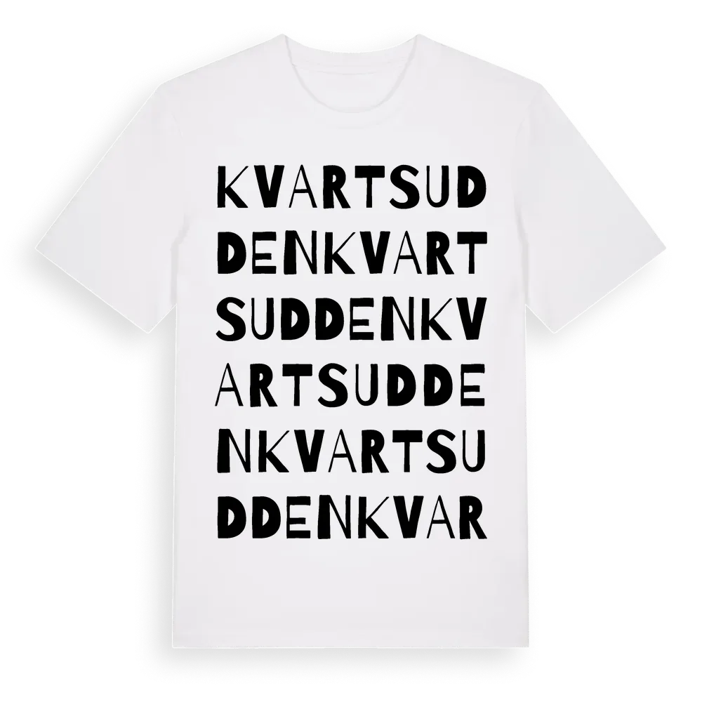 Kvartsudden ordlek t-shirt är inspirerad av Kvartsudden i Dalarnas län, Sverige. Tröjan är designad för dig som har en speciell koppling till platsen – oavsett om du bor här, har rötterna här eller bara älskar Kvartsudden.