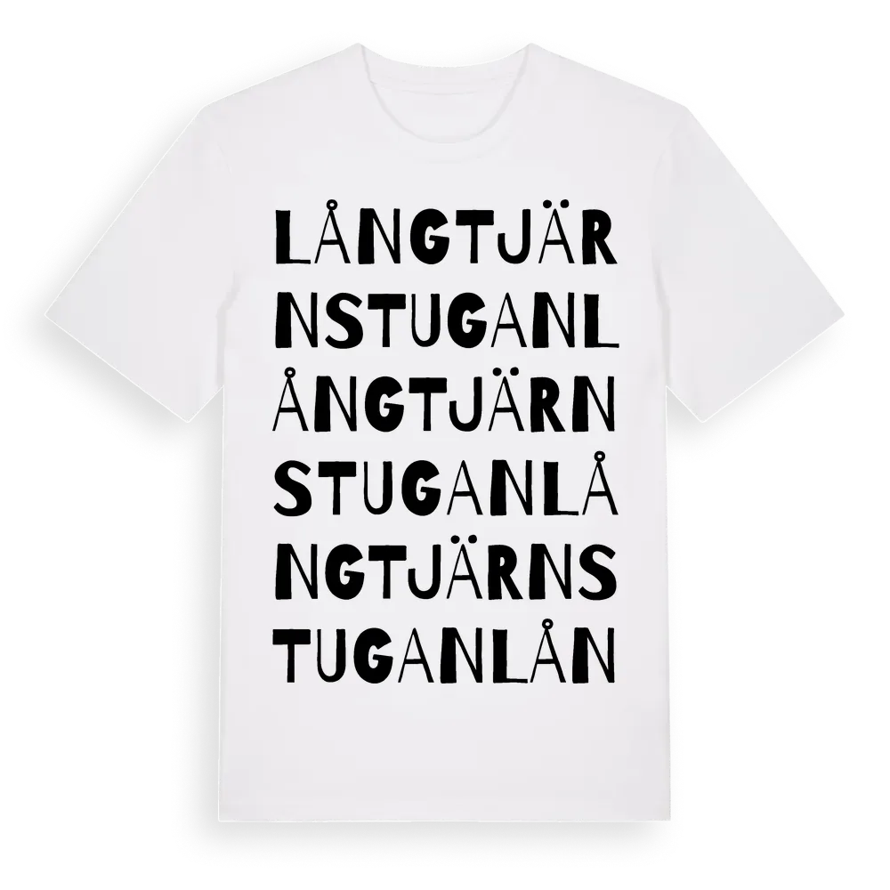 Långtjärnstugan ordlek t-shirt är inspirerad av Långtjärnstugan i Dalarnas län, Sverige. Tröjan är designad för dig som har en speciell koppling till platsen – oavsett om du bor här, har rötterna här eller bara älskar Långtjärnstugan.