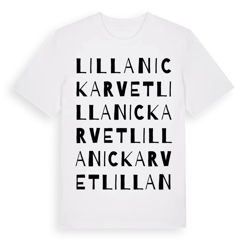 Lilla Nickarvet ordlek t-shirt är inspirerad av byn Lilla Nickarvet i Dalarnas län, Sverige. Tröjan är designad för dig som har en speciell koppling till platsen – oavsett om du bor här, har rötterna här eller bara älskar Lilla Nickarvet.