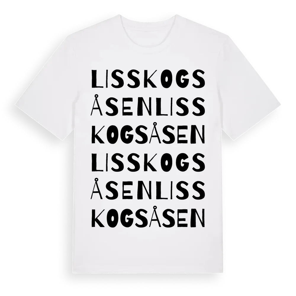 Lisskogsåsen ordlek t-shirt är inspirerad av Lisskogsåsen i Dalarnas län, Sverige. Tröjan är designad för dig som har en speciell koppling till platsen – oavsett om du bor här, har rötterna här eller bara älskar Lisskogsåsen.