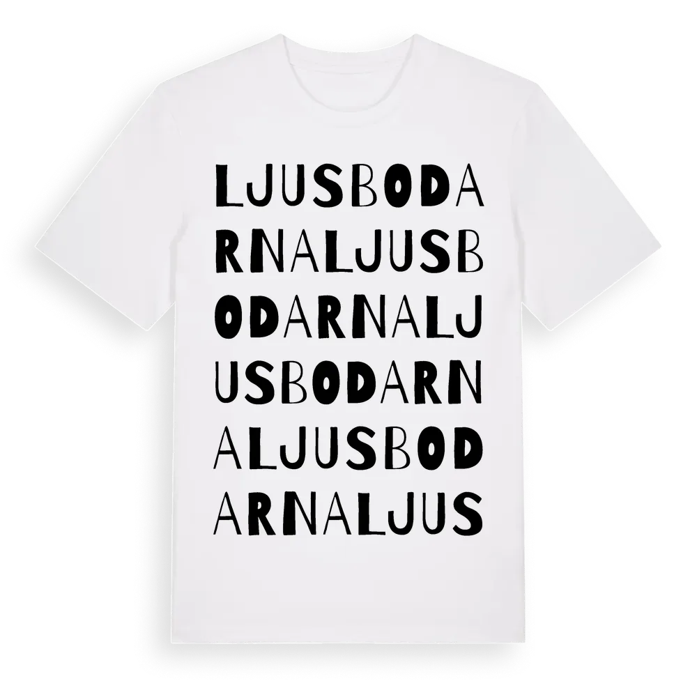 Ljusbodarna ordlek t-shirt är inspirerad av Ljusbodarna i Dalarnas län, Sverige. Tröjan är designad för dig som har en speciell koppling till platsen – oavsett om du bor här, har rötterna här eller bara älskar Ljusbodarna.