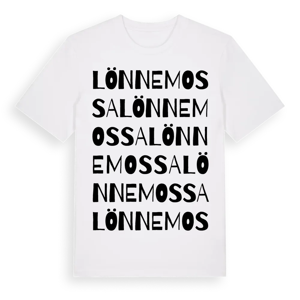 Lönnemossa ordlek t-shirt är inspirerad av byn Lönnemossa i Dalarnas län, Sverige. Tröjan är designad för dig som har en speciell koppling till platsen – oavsett om du bor här, har rötterna här eller bara älskar Lönnemossa.