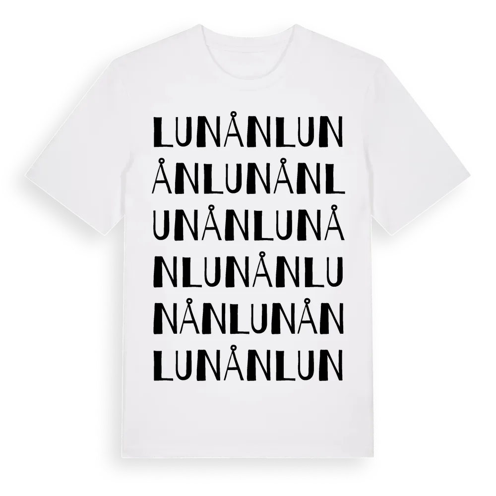 Lunån ordlek t-shirt är inspirerad av byn Lunån i Dalarnas län, Sverige. Tröjan är designad för dig som har en speciell koppling till platsen – oavsett om du bor här, har rötterna här eller bara älskar Lunån.