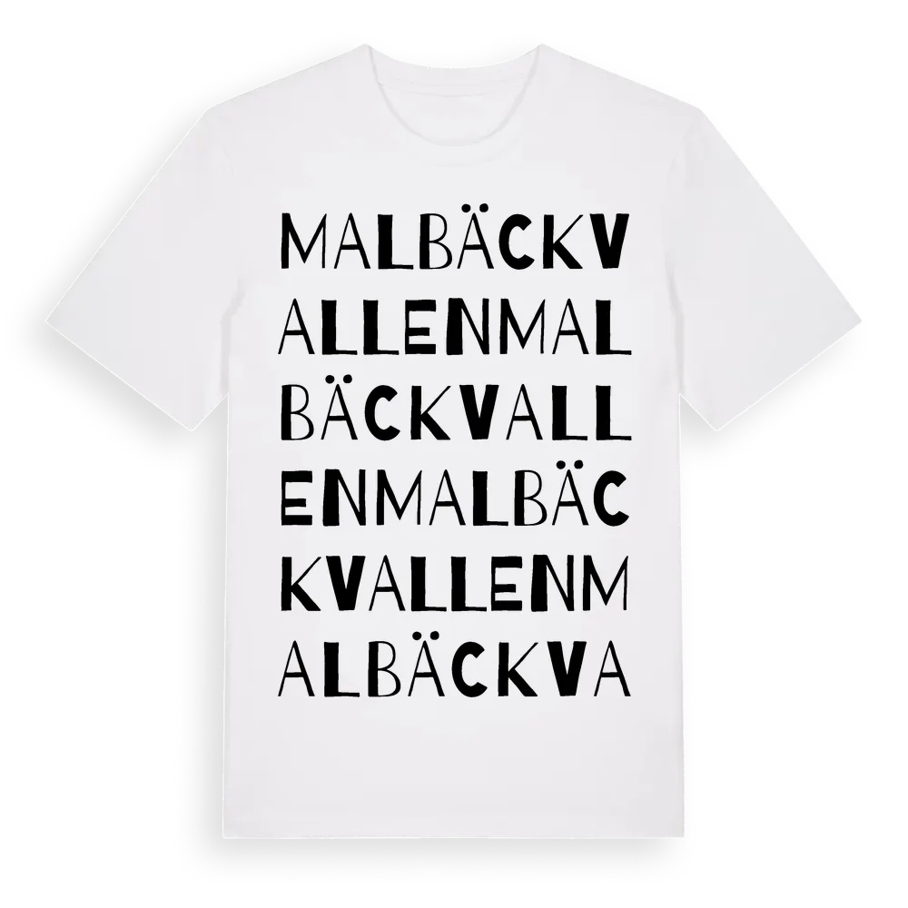 Malbäckvallen ordlek t-shirt är inspirerad av Malbäckvallen i Dalarnas län, Sverige. Tröjan är designad för dig som har en speciell koppling till platsen – oavsett om du bor här, har rötterna här eller bara älskar Malbäckvallen.