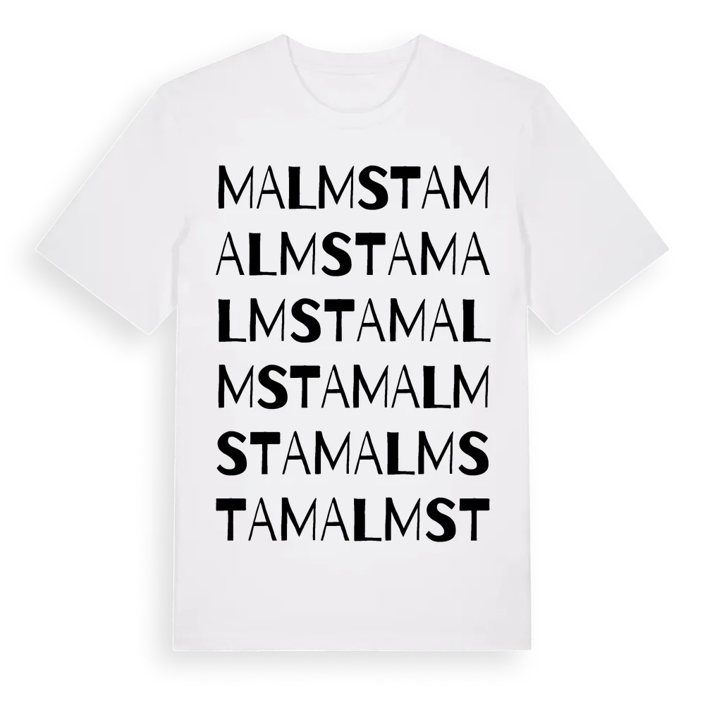 Malmsta ordlek t-shirt är inspirerad av byn Malmsta i Dalarnas län, Sverige. Tröjan är designad för dig som har en speciell koppling till platsen – oavsett om du bor här, har rötterna här eller bara älskar Malmsta.