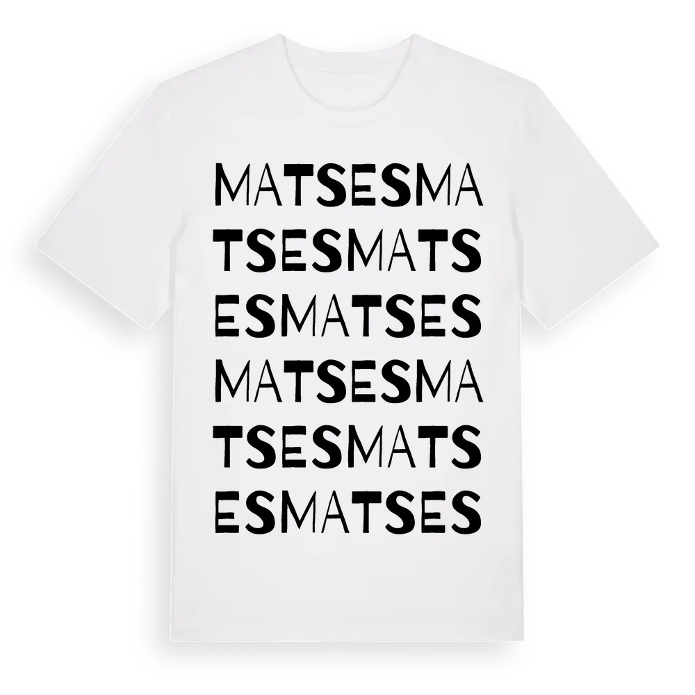 Matses ordlek t-shirt är inspirerad av Matses i Dalarnas län, Sverige. Tröjan är designad för dig som har en speciell koppling till platsen – oavsett om du bor här, har rötterna här eller bara älskar Matses.