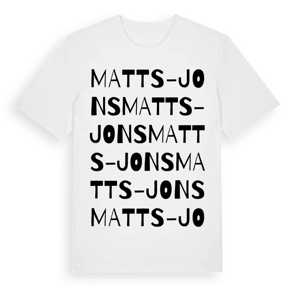 Matts-Jons ordlek t-shirt är inspirerad av Matts-Jons i Dalarnas län, Sverige. Tröjan är designad för dig som har en speciell koppling till platsen – oavsett om du bor här, har rötterna här eller bara älskar Matts-Jons.