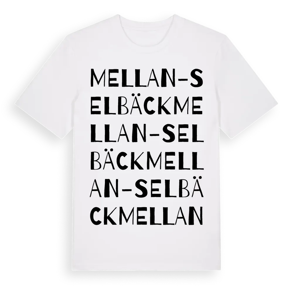Mellan-Selbäck ordlek t-shirt är inspirerad av byn Mellan-Selbäck i Dalarnas län, Sverige. Tröjan är designad för dig som har en speciell koppling till platsen – oavsett om du bor här, har rötterna här eller bara älskar Mellan-Selbäck.